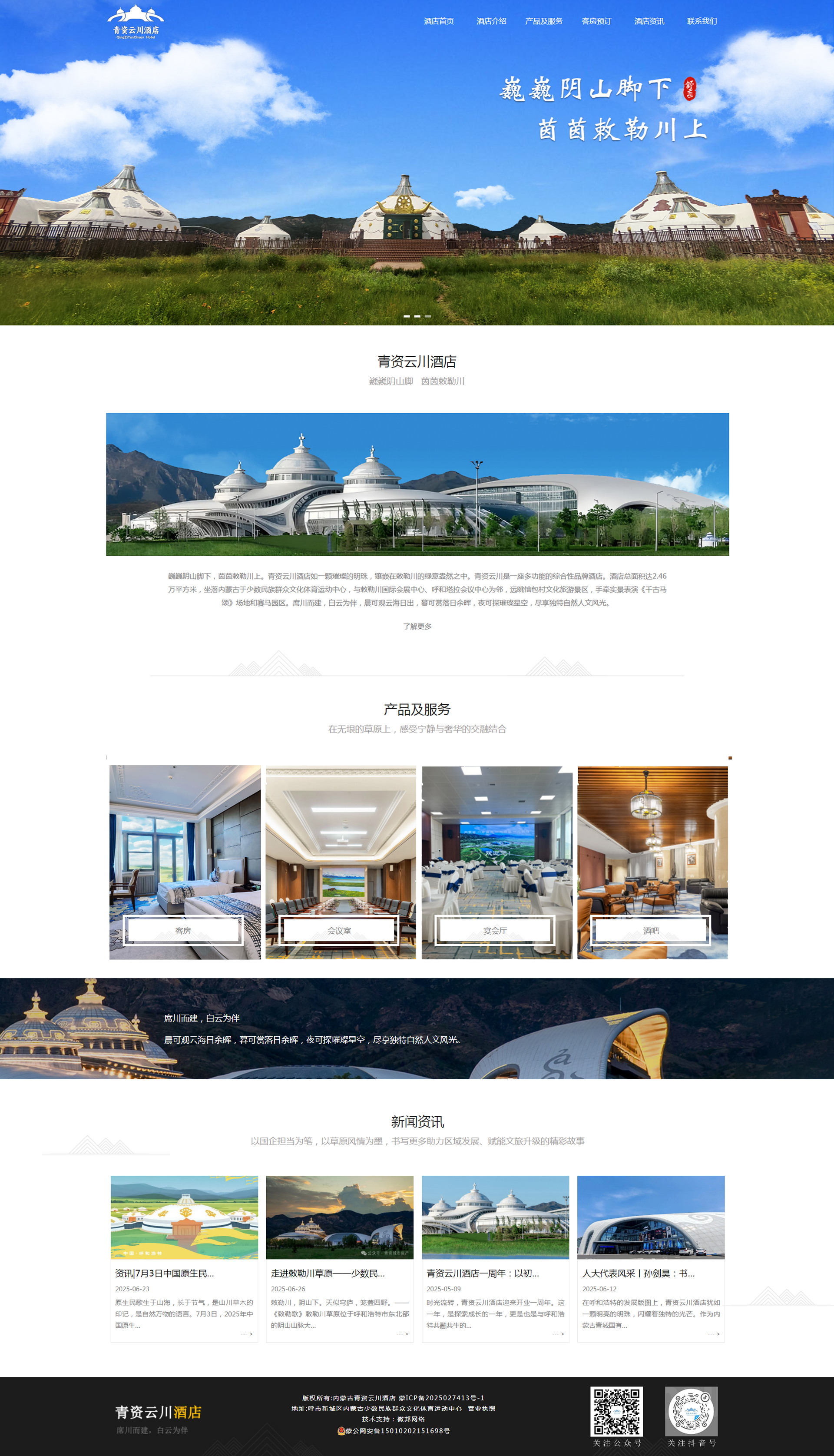 巍巍陰山腳下,茵茵敕勒川上。青資云川酒店如一顆璀璨的明珠,鑲嵌在敕勒川的綠意盎然之中。青資云川是一座多功能的綜合性品牌酒店。酒店總面積達2.46萬平方米,坐落內(nèi)蒙古于少數(shù)民族群眾文化體育運動中心,與敕勒川國際會展中心、呼和塔拉會議中心為鄰,遠眺惱包村文化旅游景區(qū),手牽實景表演《千古馬頌》場地和賽馬園區(qū)。席川而建,白云為伴,晨可觀云海日出,暮可賞落日余暉,夜可探璀璨星空,盡享獨特自然人文風光。