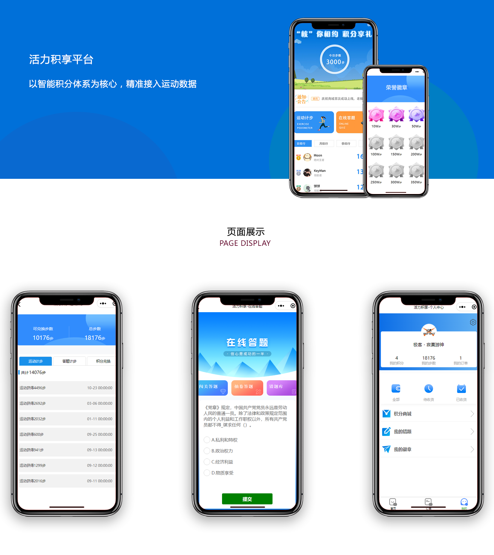 XX集團活力積享平臺依托微信小程序即用即走,以智能積分體系為核心,精準(zhǔn)接入運動數(shù)據(jù),實時統(tǒng)計并轉(zhuǎn)換積分,動態(tài)生成多維榜單,達標(biāo)贈專屬徽章,激發(fā)全員參與;創(chuàng)新“闖關(guān)+抽題”雙模式答題,靈活題庫與實時反饋,自動歸檔錯題,實現(xiàn)趣味學(xué)習(xí)與積分雙贏;積分可兌多樣化禮品,后臺自定義規(guī)則與商品庫,全流程在線審核透明高效;搭配智能管理后臺,多端登錄一鍵管控用戶、題庫、商城及數(shù)據(jù),分類統(tǒng)計直觀清晰,年度自動重置保障公平,助力企業(yè)數(shù)字化管理升級!